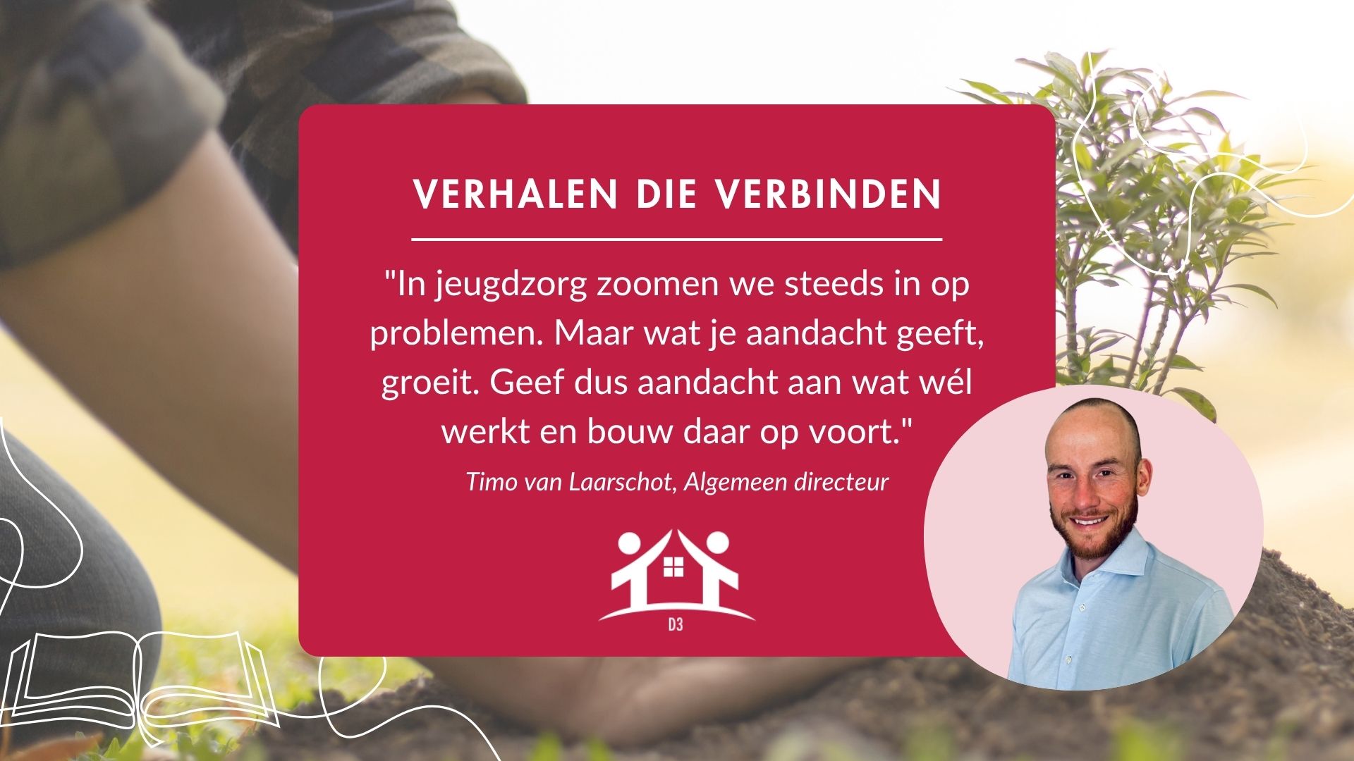 “In jeugdzorg zoomen we steeds in op problemen. Maar wat je aandacht geeft, groeit. Dus geef aandacht aan wat wél werkt. Wat wél goed gaat. Wat een kind wél kan. Wat wél lukt. En bouw daar op voort.”